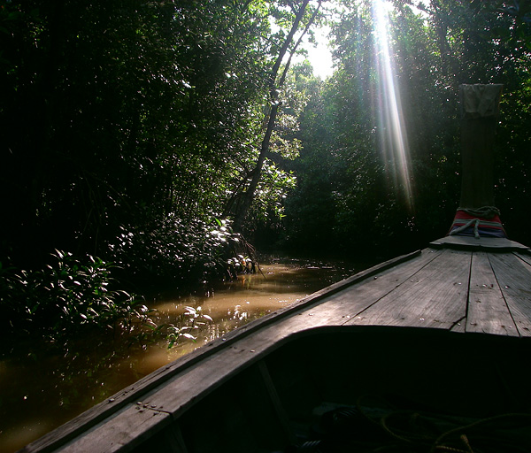 クラビ港の奥、意表をついた位置に残っているマングローブの迷路をすすむ。船頭を見つけるのが大変だったが、結果オーライだ。