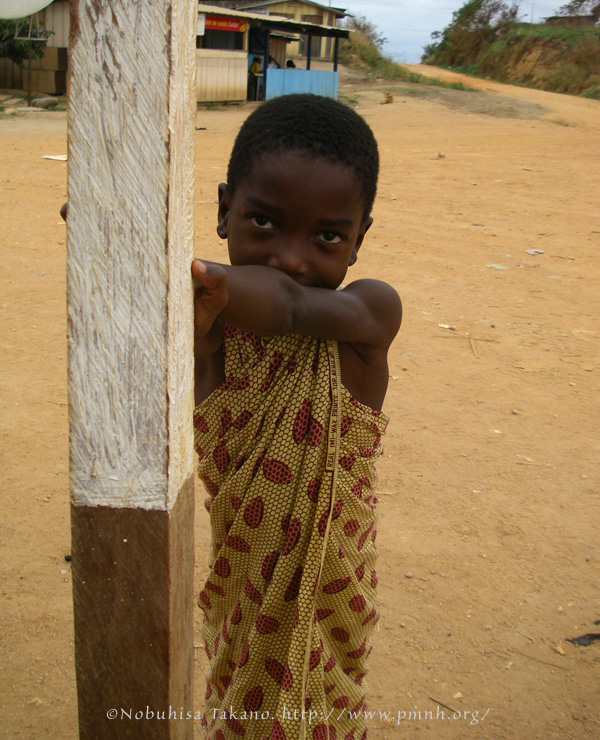 写真はロペ村で撮影した現地の子供。現地、と言っても、服装が違うことで判る通り、現地人の子ではなく、マリから来た労働者の子供だ。マリの人は、煙突のような体にクルクルとおしゃれな布を巻き付けてスタスタと歩いている。この子も照れ屋だったが、別の大人に「服がお洒落ですね」と言ったら随分照れていた。そういう国民性なのかもしれない。
