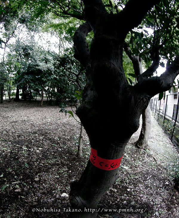 僕にとって幸運だったのは、タイミング良く行動に移せたために、一部ではあるが、都の実地承認の作業に立ち会わせてもらうことができたことだ。そしてそれより多分もっと幸運だったのは、都の責任者の方に、「危険木・越境木など、本当に必要なもの以外は伐らない」「鬱蒼と茂っている林がこの公園のひとつの特徴である」という認識、さらに言えば自然公園のあり方や種の多様性に対する理解があったことで、実地検分は、伐採計画の大幅縮小という結果で終了した。具体的に言うと、210余の候補に対して現時点で赤テープは約20本である。今後、伐採予定の標識を設置して、住民からの意見などを最終確認した後、実行に移されるということだ。自分の観察フィールドや思い出のある木に赤テープが巻かれていた人は、言えばまだ間に合う。ちなみに、青テープは剪定予定対象樹木だ。