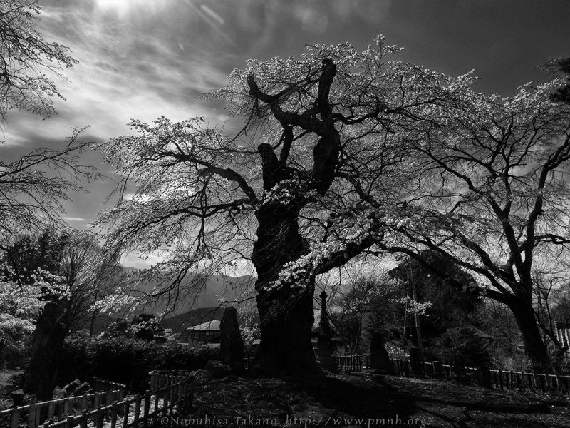 一週間の休みが今週になったのは偶然だが、タイミングとしてはよかった。突然の吹雪などはまだ来るし、霜柱も立つが、じわじわと芽も伸び、花も咲き出して、立派な春が始まったところ。晴れた日には里に降りて、ゆっくりと花見を愉しんだ、というわけで写真は里の花見散歩から。「どういう風に撮ってるの?」「天の邪鬼だからね、白黒にするよ」「あら、それは本当に天の邪鬼」「こんな日にカラーなんて、ありえないな」