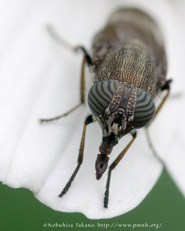 大東島で親しんでいなかったら多分素通りしたのではないか、という位の、小さな、遠めには地味な蝿だけれど、近寄ればやはりあのカッコいい複眼ストライプは健在であった。アーム折り畳み式の口吻も相変わらずすばらしい。一本目と六本目が色違いのストライプを見ながら、昔の冷や麦みたいだなぁ、などと見当違いの感想を抱きつつ、シャッターを切った。アカツメクサの赤のバックグラウンドが、ちょっと新鮮だった。