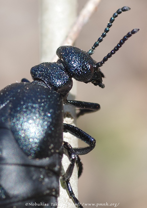 ははーんツチハンミョウだなと思いつつ、実のところこの連中はあまりじっくり見た記憶がない。まえに見た近縁のマメハンミョウは毒毒しくて、わたしヤバいんですよオーラを全方位に振りまいていたが、これはやや地味な濃紺、だけど光を鈍く反射する風体はやはりどこか異様。